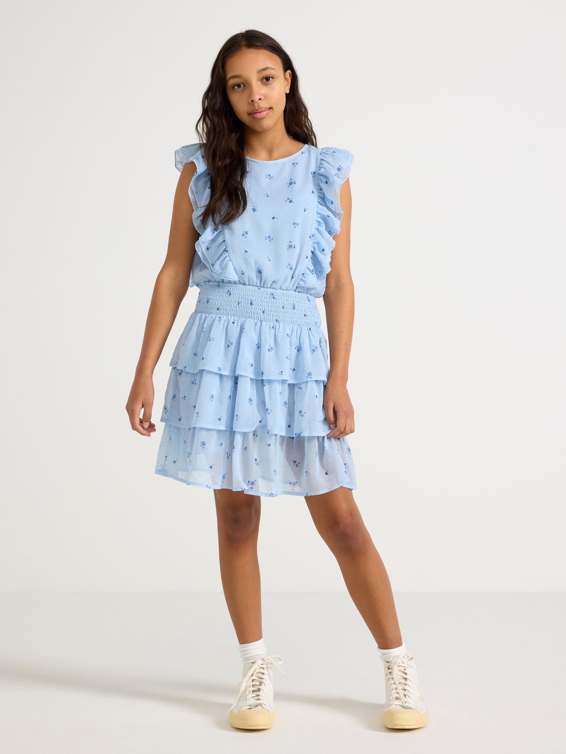Kortärmad klänning med volanger, glittriga detaljer och smockmidja.