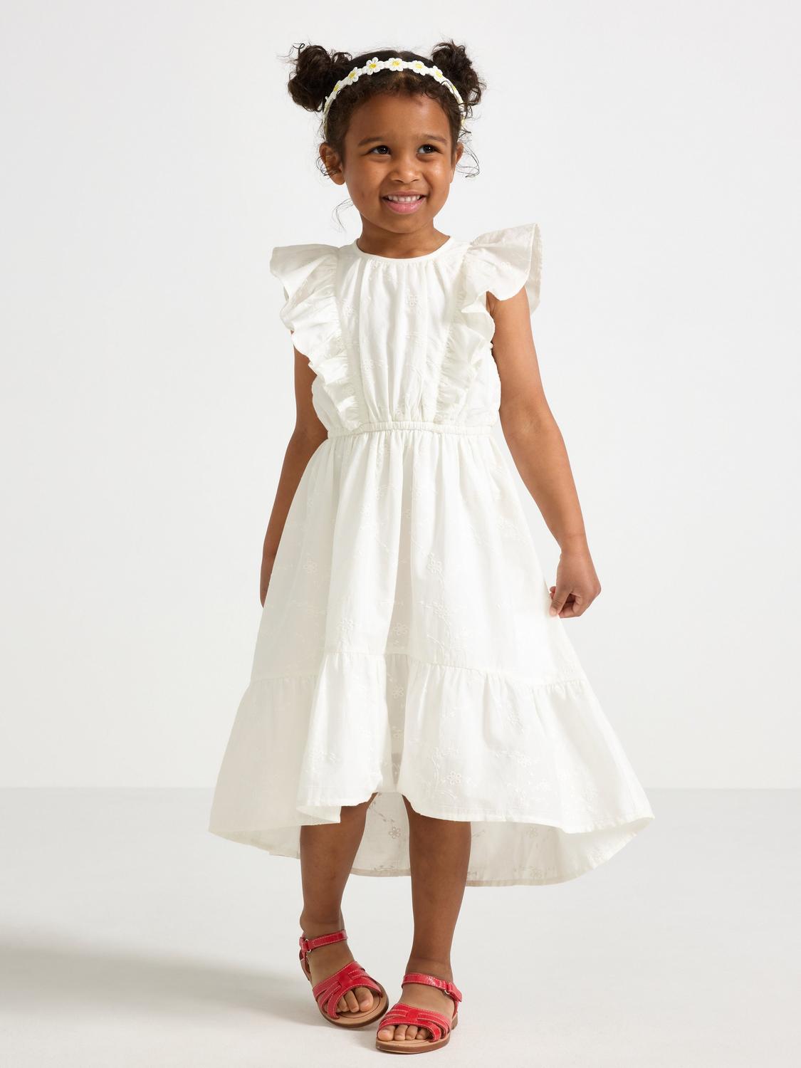 Vävd klänning i mjuk bomull med broderade detaljer, volangärmar och asymmetrisk nederkant.