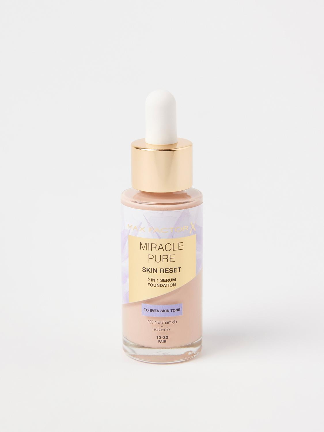 Max Factor Miracle Pure 2in1 Skin Reset är en hybridprodukt som kombinerar serum och foundation. Den innehåller niacinamid och bisabolol som vårdar och lugnar huden samtidigt som den ger en jämnare hudton och en sammetslen finish. Formulan ger en medium täckning med en naturlig satinmatt finish och passar även känslig hud.