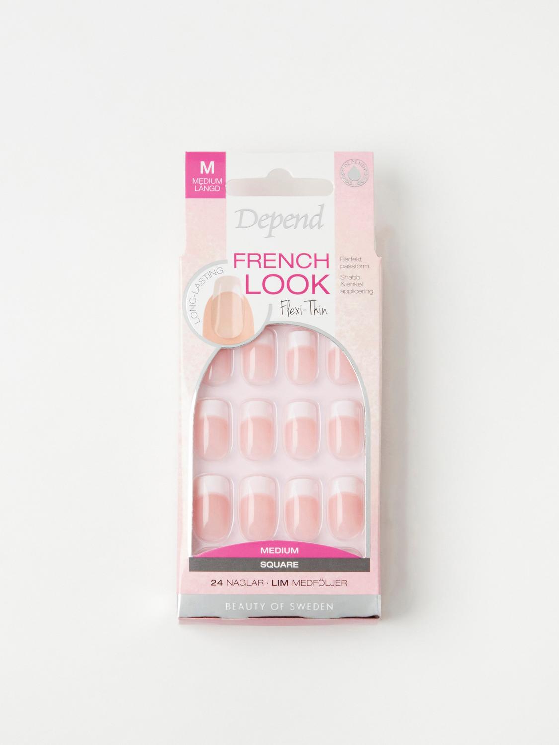 Lösnaglar för en perfekt fransk manikyr på bara några minuter. Flexi-Thin ger den ultimata passformen, är enkla att applicera och har en högglansig yta som varken flagnar eller tappar färg. Lim medföljer. OBS! Vi rekommenderar max 10 dagars användning av lösnaglar i sträck. Sedan skall naglarna luftas innan en ny applicering kan göras, förutsatt att dina naglar då är i god kondition. Vid borttagning av lösnaglar använd Depend Lösnagelremover. OBS! Bryt eller drag aldrig av lösnageln eftersom det kan skada din naturliga nagel.Försiktighetsåtgärder för lim: Om hudens ytor klistras fast, dra ej utan använd en acetonbaserad remover. Använd aldrig lösnaglar om dina naturliga naglar är tunna, skadade eller infekterade. Undvik hetta. Nagellim kan fläcka eller skada tyg. Skydda ytor mot eventuellt spill innan limmet öppnas. Avlägsna kapsylen, håll limtuben upprätt och vrid av vingen för att öppna limmet. OBS: Tuben är en engångsförpackning och kan inte återförslutas. Lägg därför inte den öppna tuben ned, då limrester kan läcka ut. Cyanoakrylat. Fara. Fäster snabbt på hud och ögon. Förvaras oåtkomligt för barn. Orsakar allvarlig ögonirritation. Irriterar huden. Kan orsaka irritation i luftvägarna. VID KONTAKT MED ÖGONEN: Skölj försiktigt med vatten i flera minuter. Ta ur eventuella kontaktlinser om det går lätt. Fortsätt att skölja. Vid bestående ögonirritation: Sök läkarhjälp.