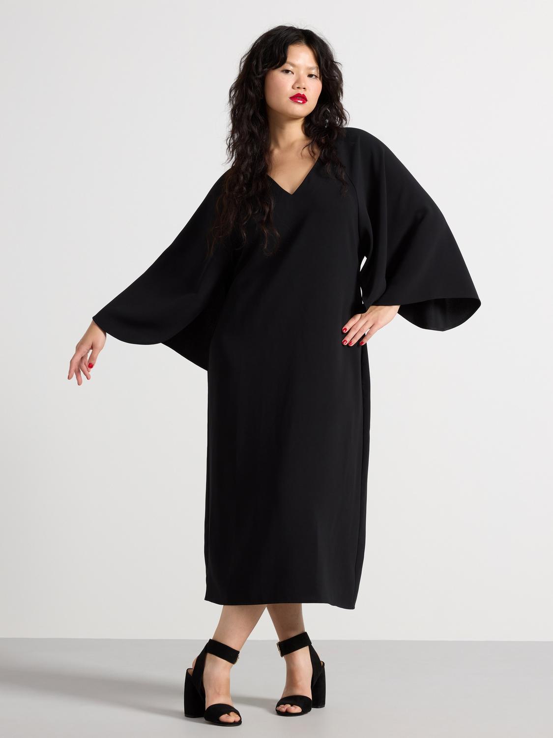 Stilsäker midiklänning med V-ringning, böljande ärmar och håldetalj baktill.