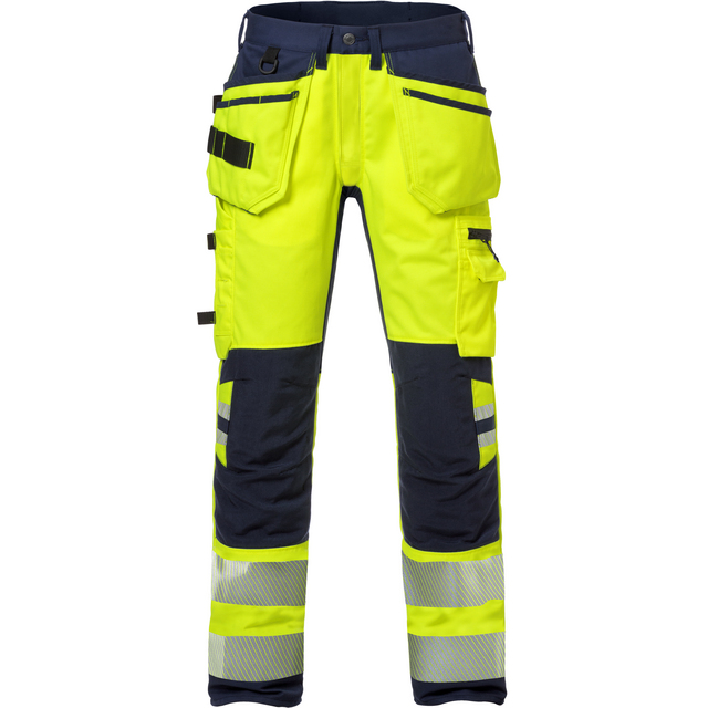 Dessa varselbyxor för dam är designade med stretchpaneler för ökad komfort och rörlighet. De är tillverkade i en slitstark marinblå och varselgul färgkombination och har praktiska knäskyddsfickor.