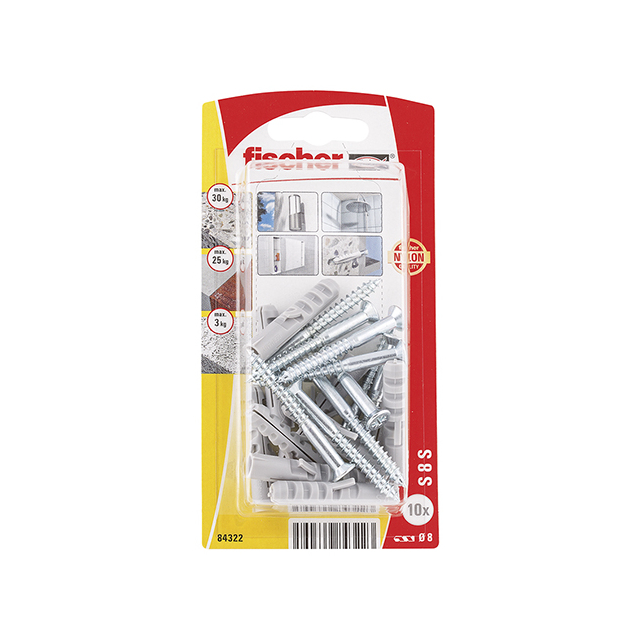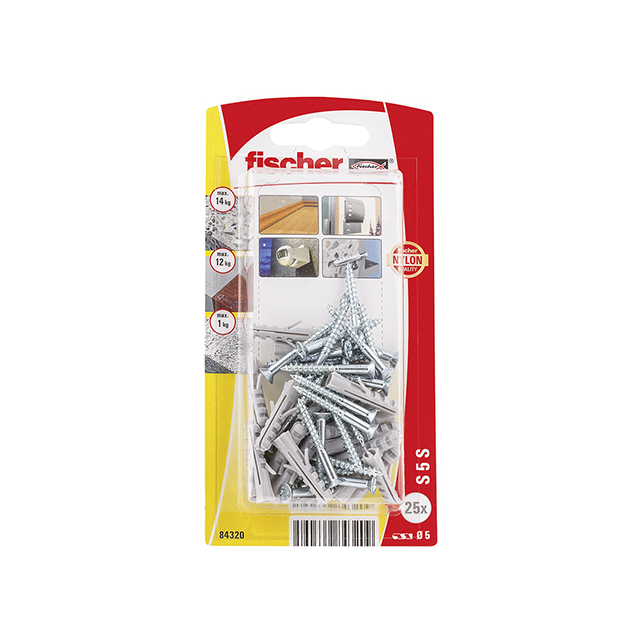 Detta set innehåller 12 stycken fischer S-pluggar med tillhörande skruvar, lämpliga för användning i betong och murbruksmaterial. Pluggarna är designade för att ge ett säkert och hållbart fäste.