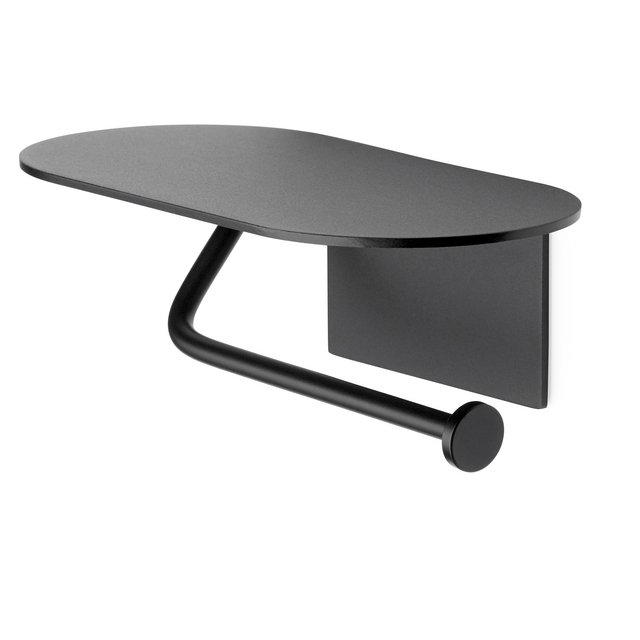 Denna toapappershållare i svart, rostfritt aluminium har en praktisk hylla för förvaring. Den är enkel att montera med självhäftande tejp och passar bra på släta ytor som kakel.