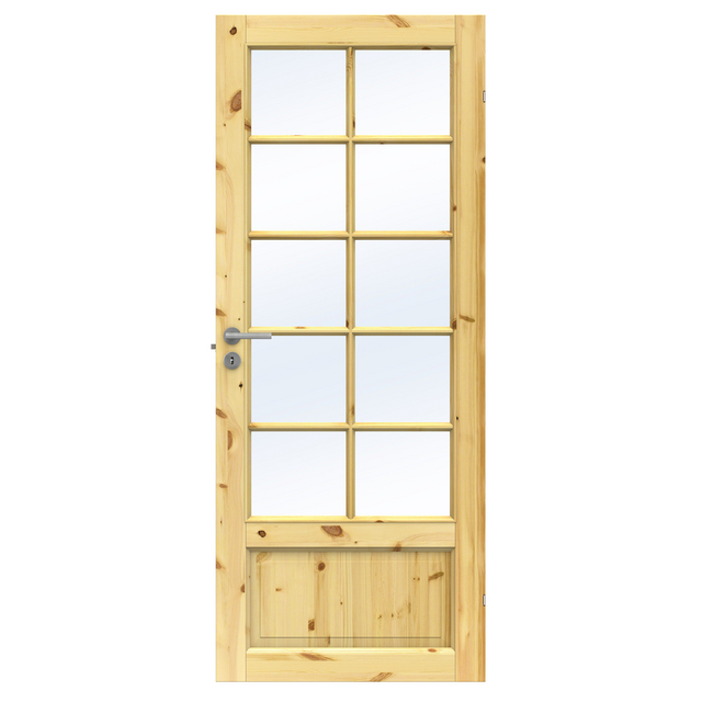 Denna innerdörr är tillverkad i massiv furu och har ett klarglasfönster. Den naturliga trästrukturen med kvistar och årsringar ger dörren en rustik känsla. Dörren passar bra i hem med en traditionell eller lantlig stil.