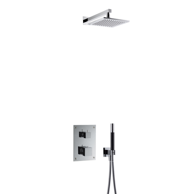Denna inbyggda duschblandare kombinerar stilren design med praktisk funktion. Med en termostat säkerställer den en jämn och behaglig temperatur under hela duschen. Finishen i krom ger badrummet en modern och elegant touch.
