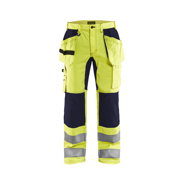 Dessa varselbyxor är designade med stretchpaneler i grenen, stussen och knäskyddsfickorna, vilket ger optimal komfort under arbetsdagen. Byxorna har praktiska hängfickor och en tumstocksficka för enkel åtkomst till verktyg. De är certifierade enligt EN ISO 20471 klass 2 för hög synlighet.