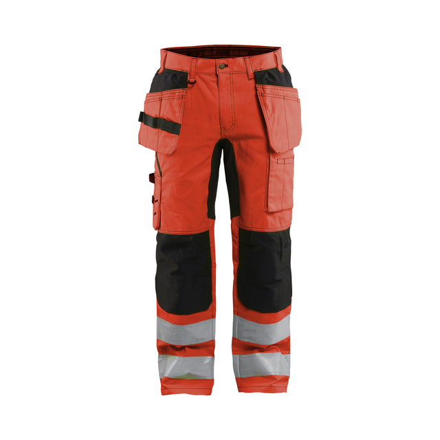 Dessa varselbyxor är utrustade med stretchpaneler för ökad komfort och rörlighet under arbetsdagen. De har praktiska hängfickor och en tumstocksficka för att hålla verktyg nära till hands. Byxorna är certifierade enligt EN ISO 20471 klass 2 för synlighet.