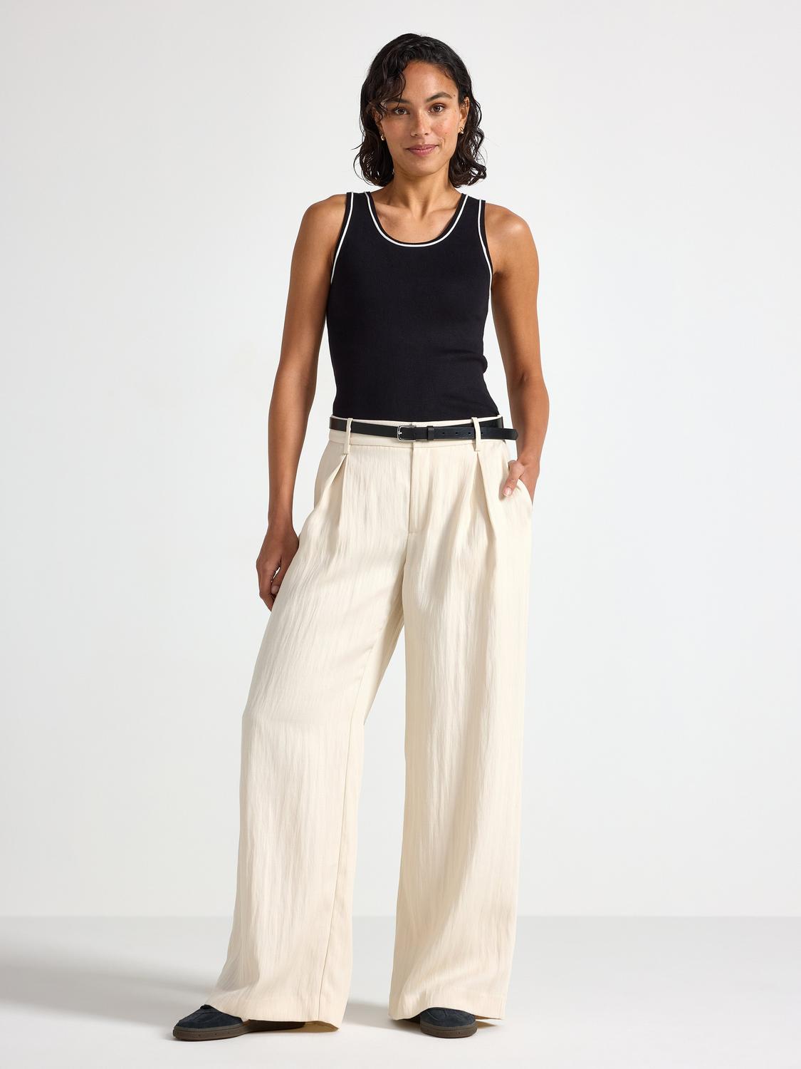 Dessa byxor från VILA har en hög midja och utsvängda ben, vilket ger en trendig silhuett. Materialet är stretchigt och följsamt för en bekväm passform. Byxorna har resår i midjan och sydda pressveck för en elegant touch.