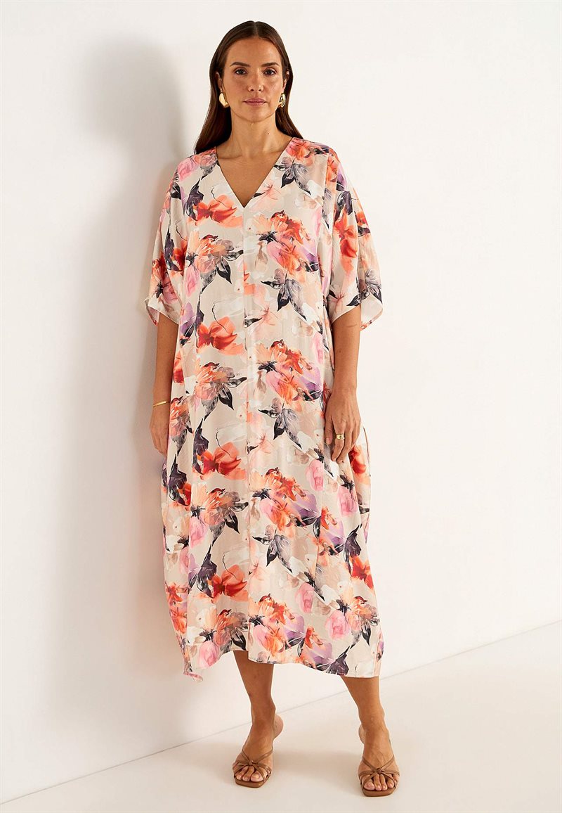 Denna raka och avslappnade kimonoklänning är tillverkad i ett härligt luftigt viskosmaterial. Klänningen har en v-ringad hals, korta vida ärmar och fastsydda knytband i midjan. Perfekt för sommarens alla fester och tillställningar.