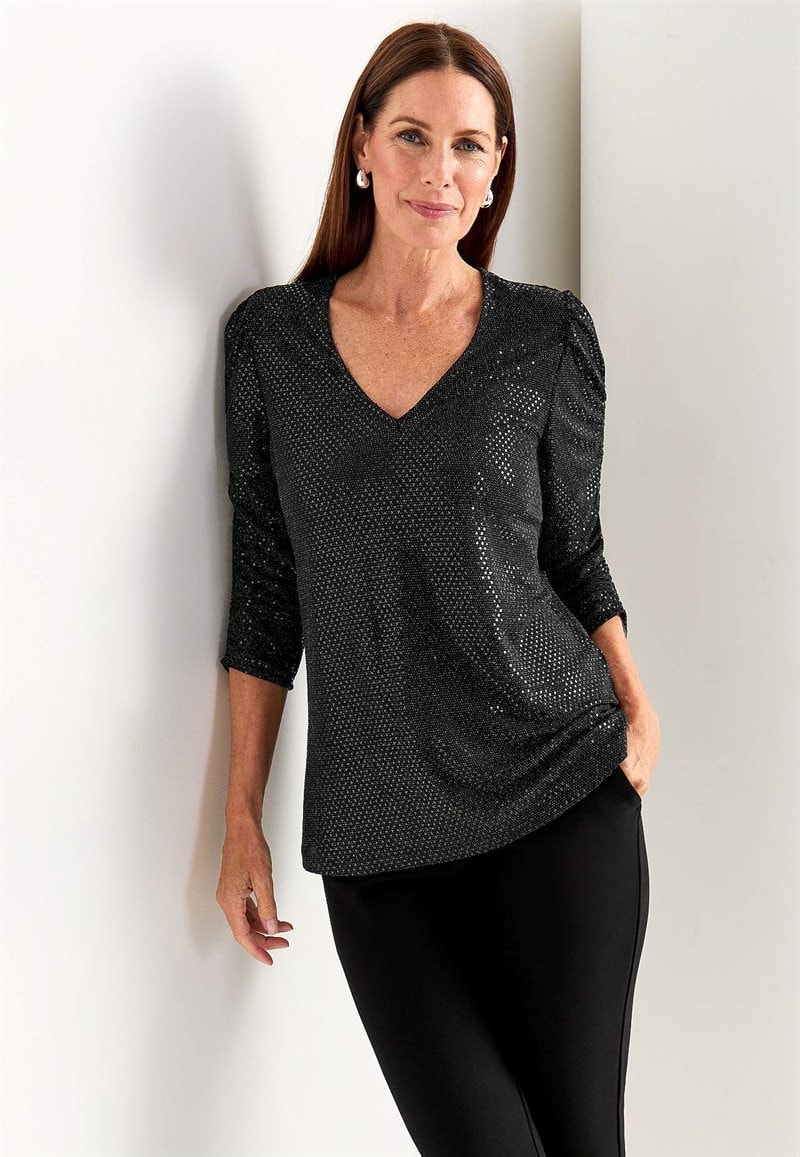 Denna glittriga festtopp är perfekt för speciella tillfällen. Den har en mjuk och stretchig trikå, en V-ringad hals och 3/4-ärmar med rynkdetaljer. Toppen har en lätt rundad nederkant och är dekorerad med silverfärgat glitter och svarta paljetter.