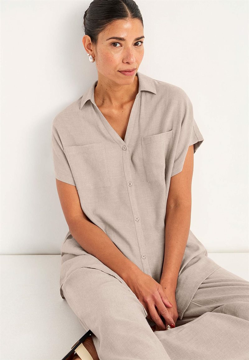 En bekväm och luftig tunika tillverkad i en mjuk blandning av viskos och linne. Tunikan har en rak passform, V-ringning med krage och praktiska bröstfickor. Perfekt för varma sommardagar.