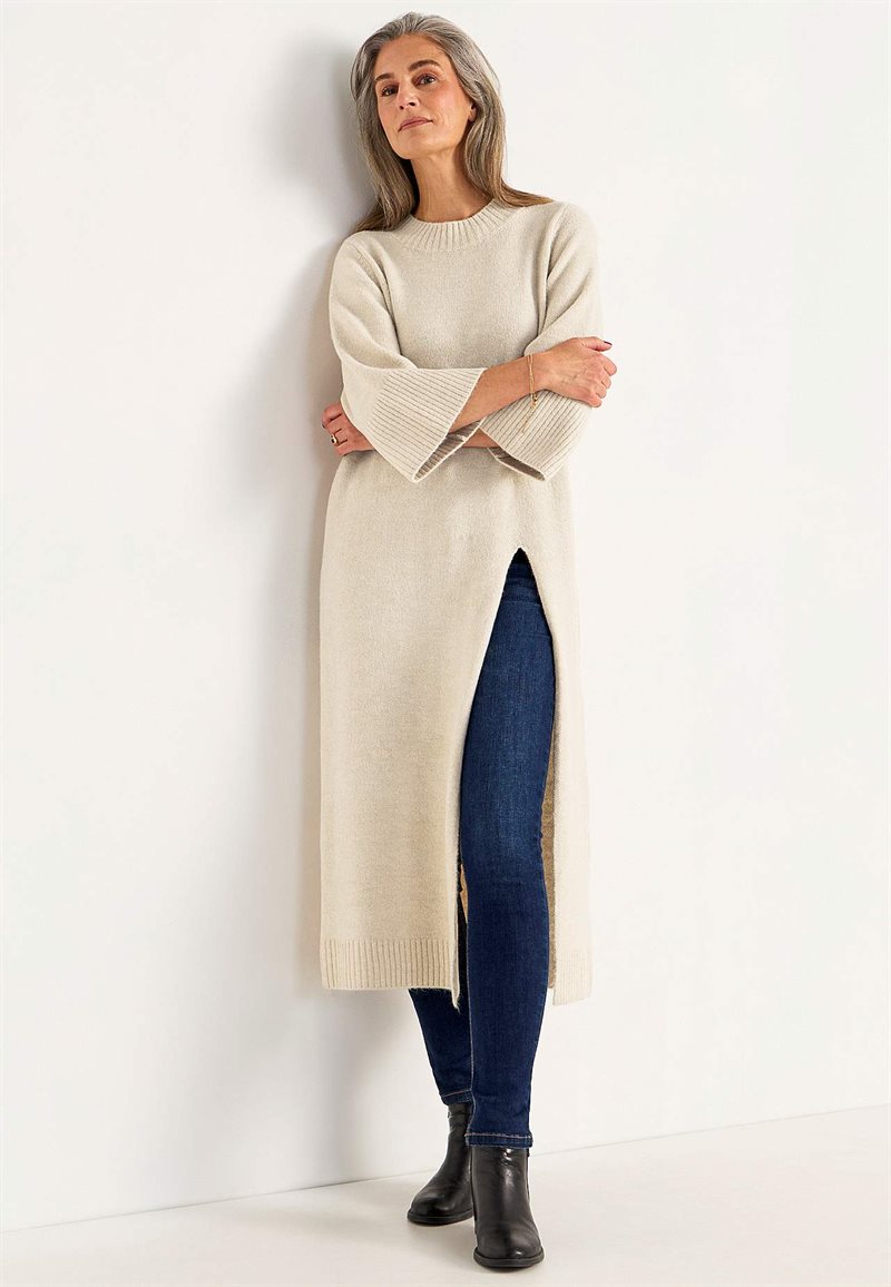 Denna finstickade klänning har en mjuk och stretchig kvalitet som gör den bekväm att bära. Klänningen har ett knytband i midjan som ger en smickrande silhuett. Med sina långa ärmar och rundhals är den perfekt för både vardag och fest.