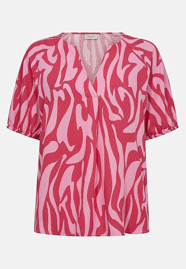 Denna mönstrade blus från Freequent är tillverkad i ett vävt viskosmaterial med en fin struktur. Blusen har en överlappad v-ringning med veck framtill och korta raglanärmar med resår i ärmsluten. Ett bekvämt och stilrent plagg för vardag och fest.