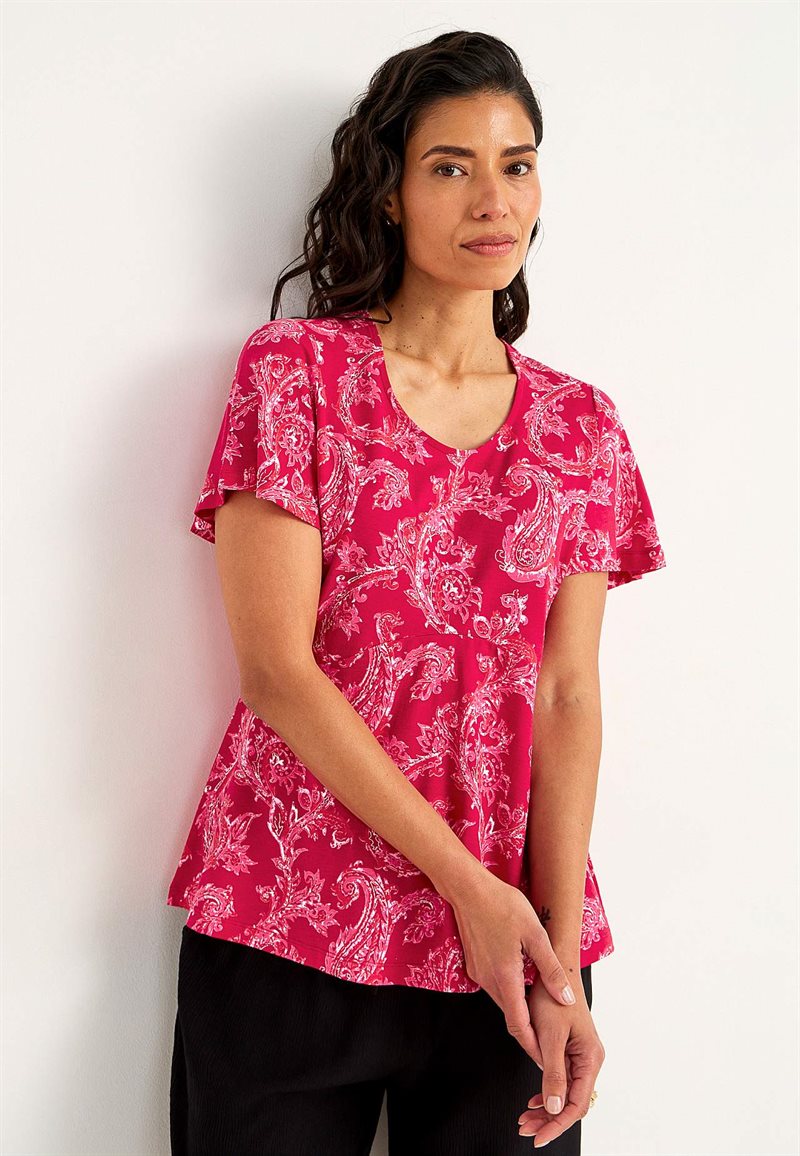 Denna mönstrade trikåtopp har en smickrande passform med avskärning i midjan och en mjuk, följsam viskostrikå. Toppen har en rund halsringning, korta vida ärmar och en rak nederkant. Längden varierar beroende på storlek.