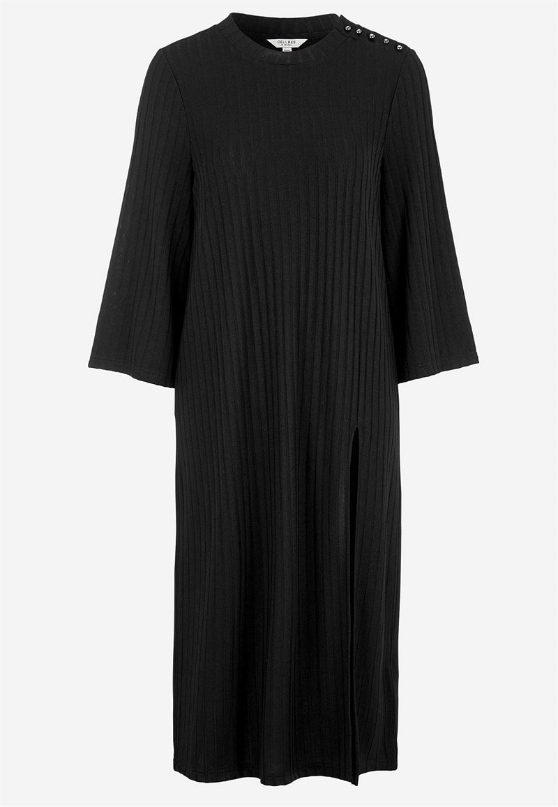 Denna ribbade trikåklänning har en rak och ledig passform. Klänningen har en rund halsringning, dekorativa knappar vid axeln och trumpetärmar. Den höga slitsen ger klänningen en elegant touch.