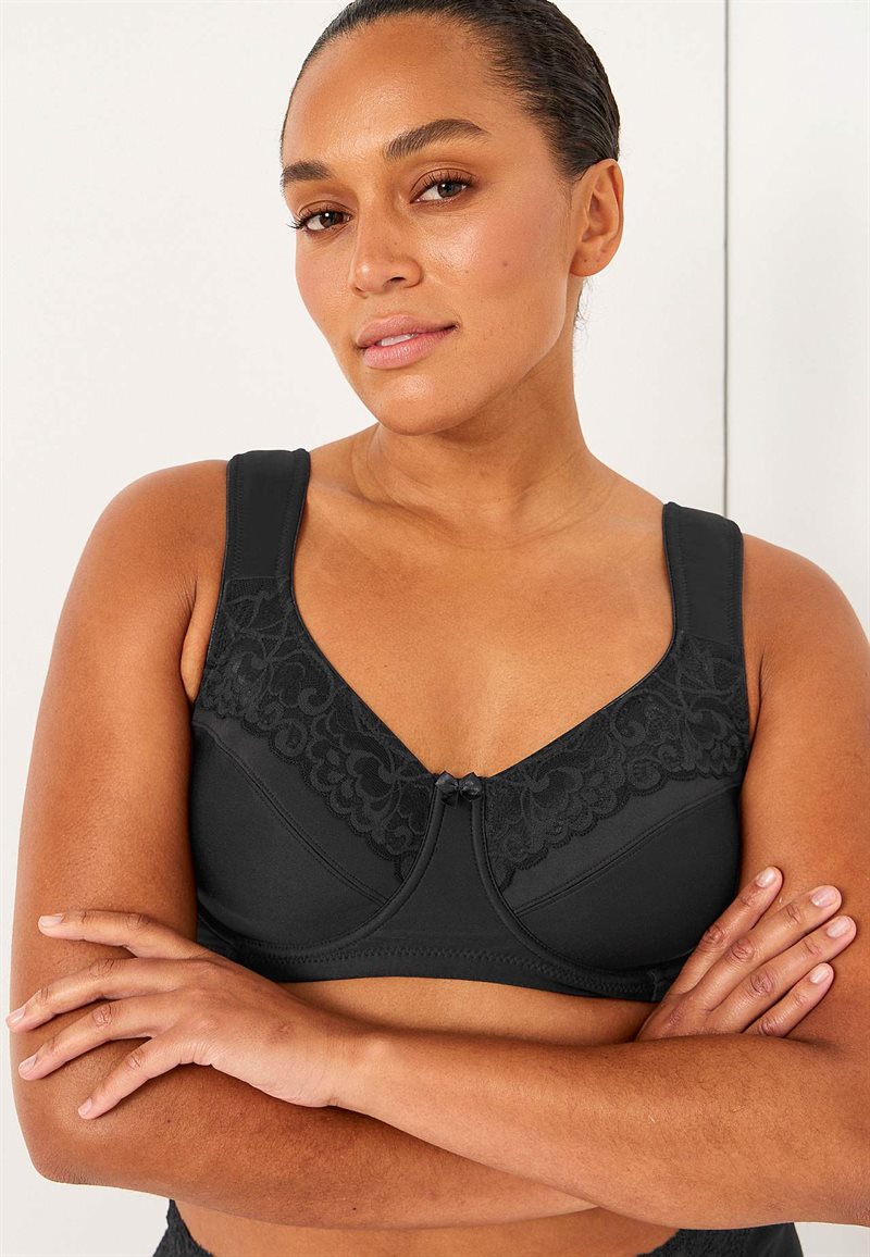 En ovadderad bygel-bh prydd med fin, elastisk spets. De formsydda kuporna ger bysten ett bra stöd och har en spetsdetalj upptill. De breda, vadderade axelbanden är justerbara för optimal komfort.