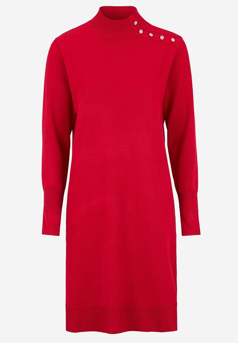 Denna finstickade klänning från Freequent är både mjuk och bekväm. Klänningen har en ledig passform och en ribbad halvpolo med dekorativa strassknappar på axeln. De långa ärmarna avslutas med breda ribbmuddar och nederkanten är också ribbad.