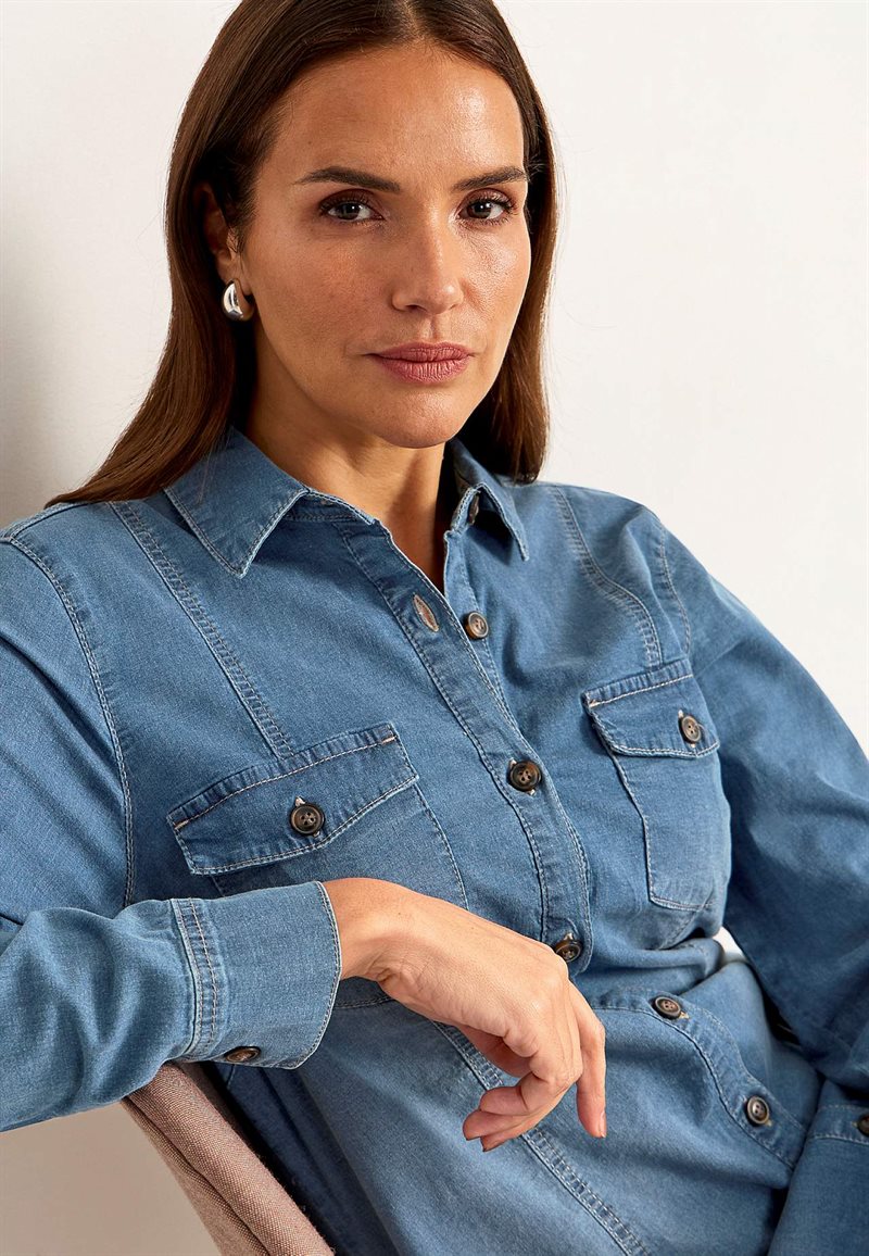 Denna klänning är tillverkad i en mjuk denimkvalitet och har en figurnära passform. Den har en klassisk krage och knappslå framtill, samt dekorativa sömmar både fram och bak. Klänningen har långa ärmar med manschetter och knappar.