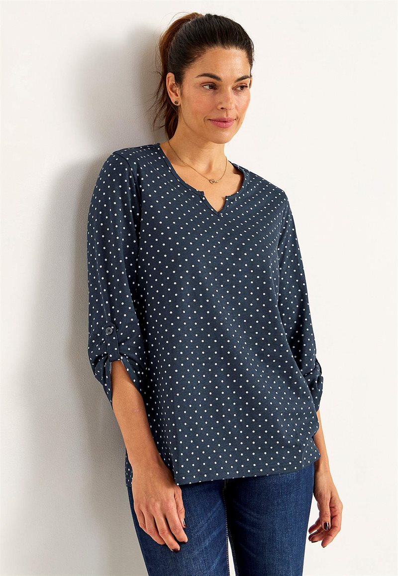 En bekväm trikåtopp i mjuk, ekologisk bomull med en lätt A-linjeform. Toppen har en rundad halsringning med en liten V-skärning och 3/4-långa ärmar som kan vikas upp. Den något rundade nederkanten är längre bak än fram.
