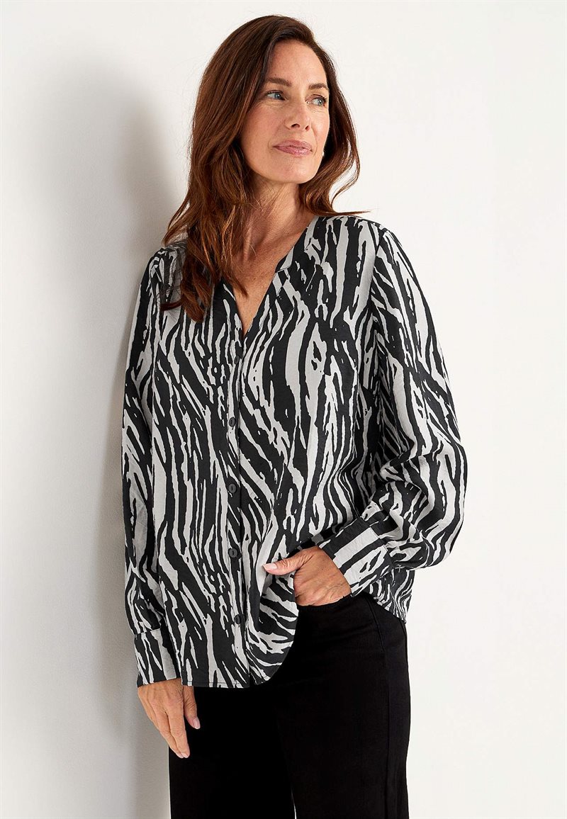 Denna blus har en fin lyster och en vågig strukturväv. Den är lätt a-linjeformad och har en genomknäppt modell med V-ringning. Blusen har långa ärmar med manschetter och en rundad nederkant som är något längre baktill.