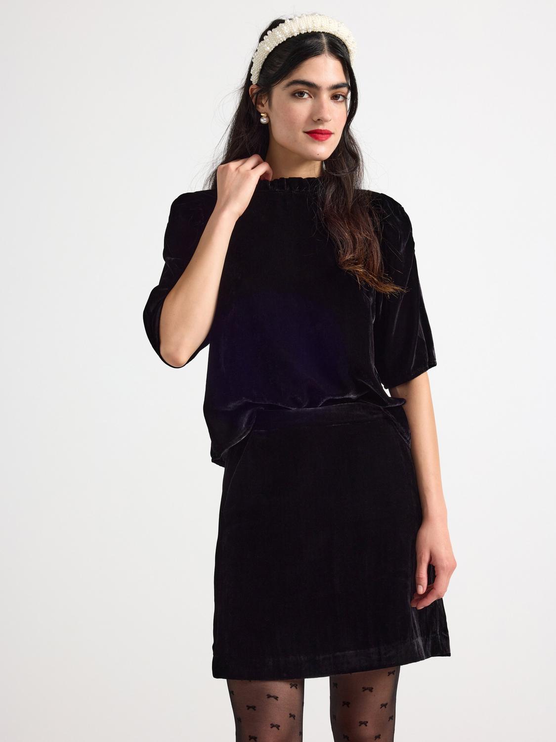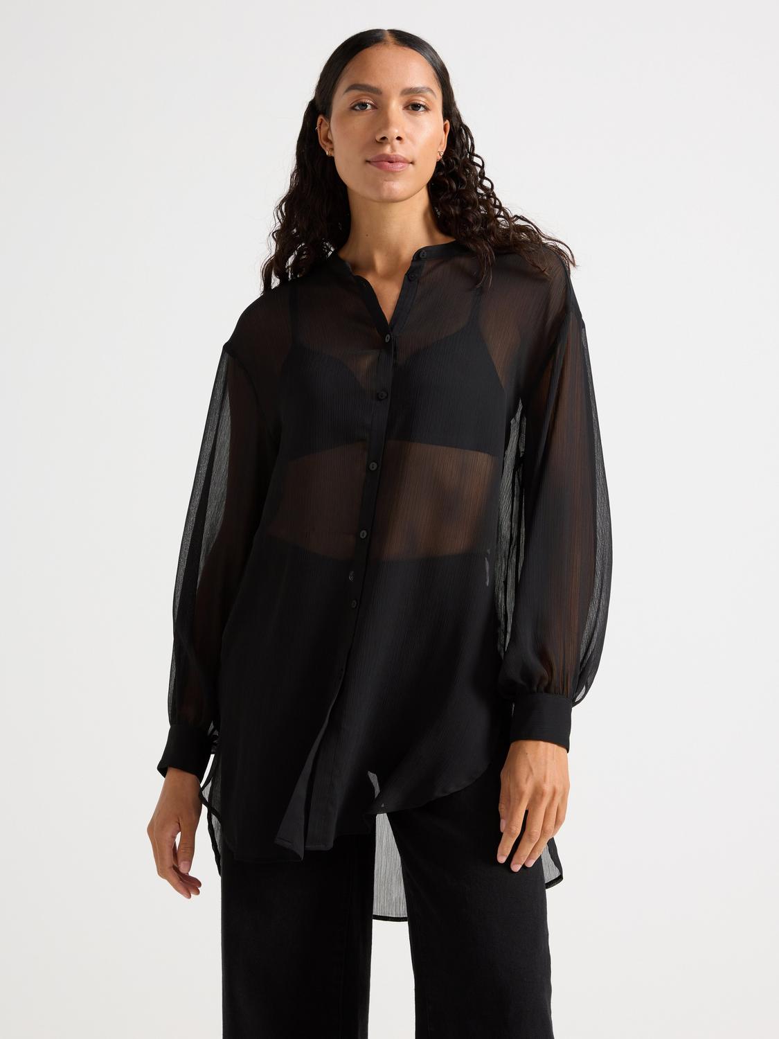 Denna blus har en strukturväv och en något rymligare passform. Den har en V-ringad hals med krage och insnitt vid bysten. Ärmarna är långa och vida med manschett, knappar och rynk i ärmsluten.