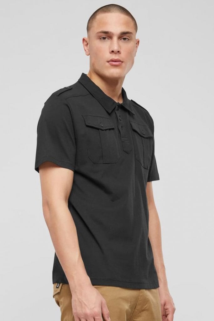 Denna pikétröja är tillverkad i ett mjukt och bekvämt bomullstyg. Designen kombinerar en militär stil med den klassiska poloskjortans utseende, vilket ger en unik och avslappnad look. Skjortan har en rak passform och en liten knäppning vid bröstet.