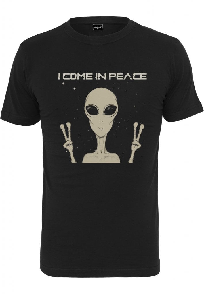 Denna T-shirt har ett humoristiskt tryck med en klassisk utomjording som gör fredstecknet. Texten "I come in peace" syns ovanför bilden. T-shirten är tillverkad av 100% bomull och finns i svart.