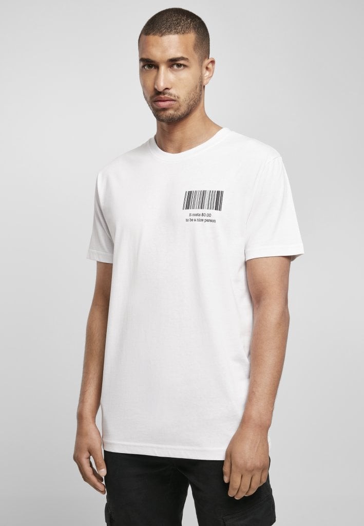 En vit t-shirt med en minimalistisk design. Den har en liten streckkod och ett budskap om att vara en snäll person. T-shirten är tillverkad i bomull och har en klassisk passform med rund hals och korta ärmar.