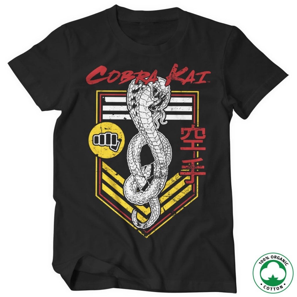 Visa din lojalitet till Cobra Kai med denna snygga t-shirt. Tillverkad i ekologisk bomull för en bekväm passform och med en cool patch som visar ditt stöd för dojon. Perfekt för fans av Karate Kid och Cobra Kai-serien.