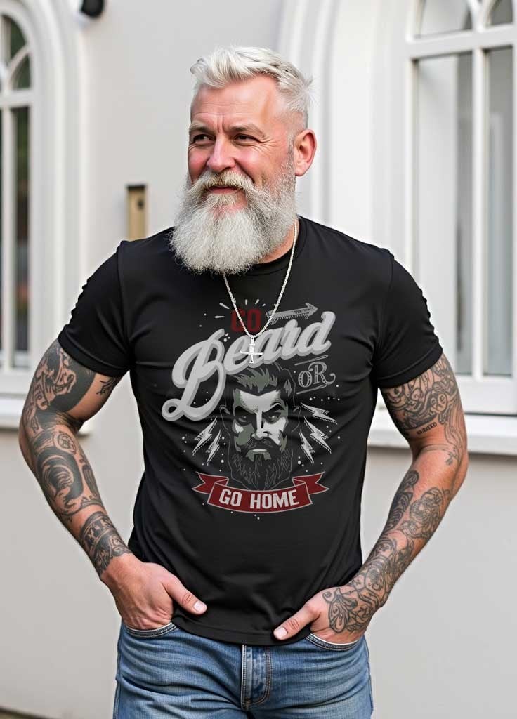 En cool t-shirt från Dirty Hank som hyllar skäggkulturen med ett tryck av texten 'Go Beard or Go Home' och ett detaljerat skäggigt ansikte. T-shirten kombinerar retrostil med moderna element och är tillverkad av 100% bomull för komfort och andningsförmåga.