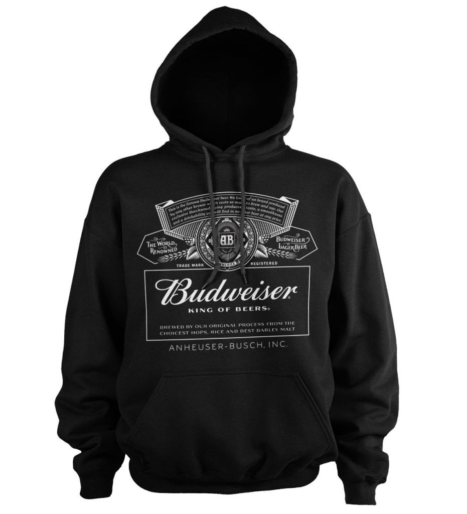 En svart hoodie med Budweisers klassiska vita logga tryckt på bröstet. Hoodien är tillverkad i en blandning av bomull och polyester för en bekväm passform. Perfekt för avslappnade dagar eller som ett statement för ditt favoritöl.