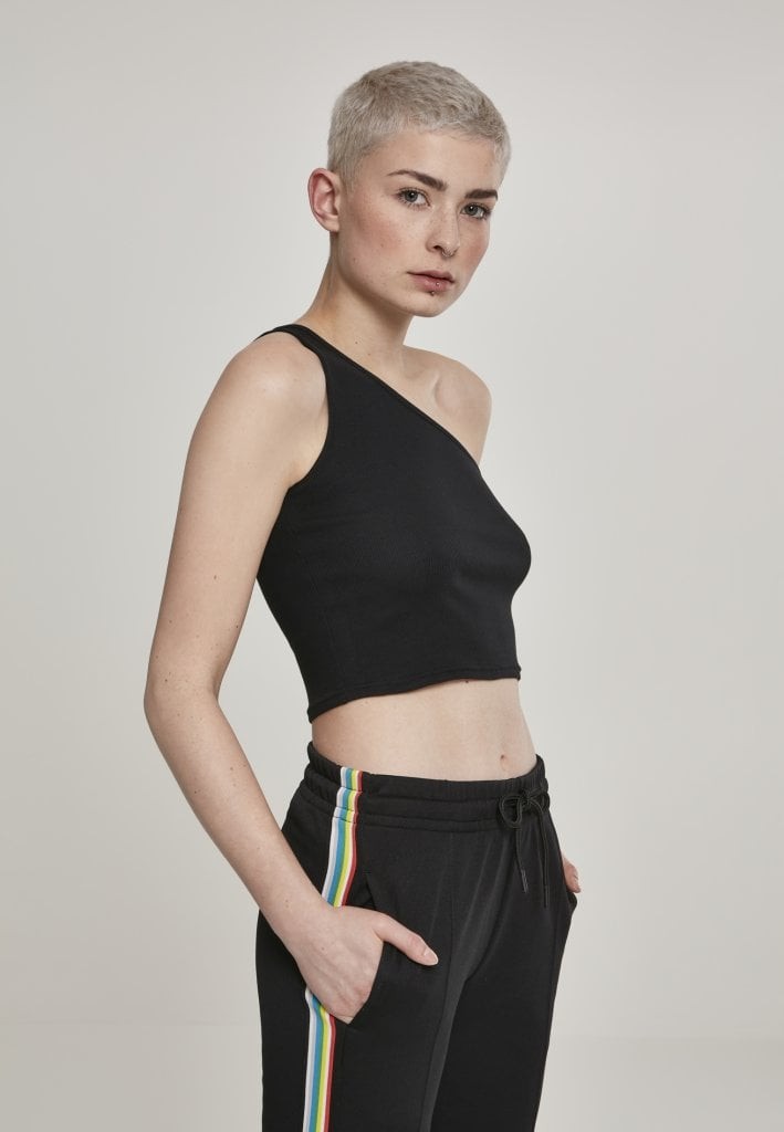 Denna korta magtröja har en sportig och trendig design med ett axelband. Toppen är tillverkad i ett ribbat bomullstyg och har en rak modell som slutar mitt på magen. Den asymmetriska skärningen och resåren i halsringningen ger en unik touch.