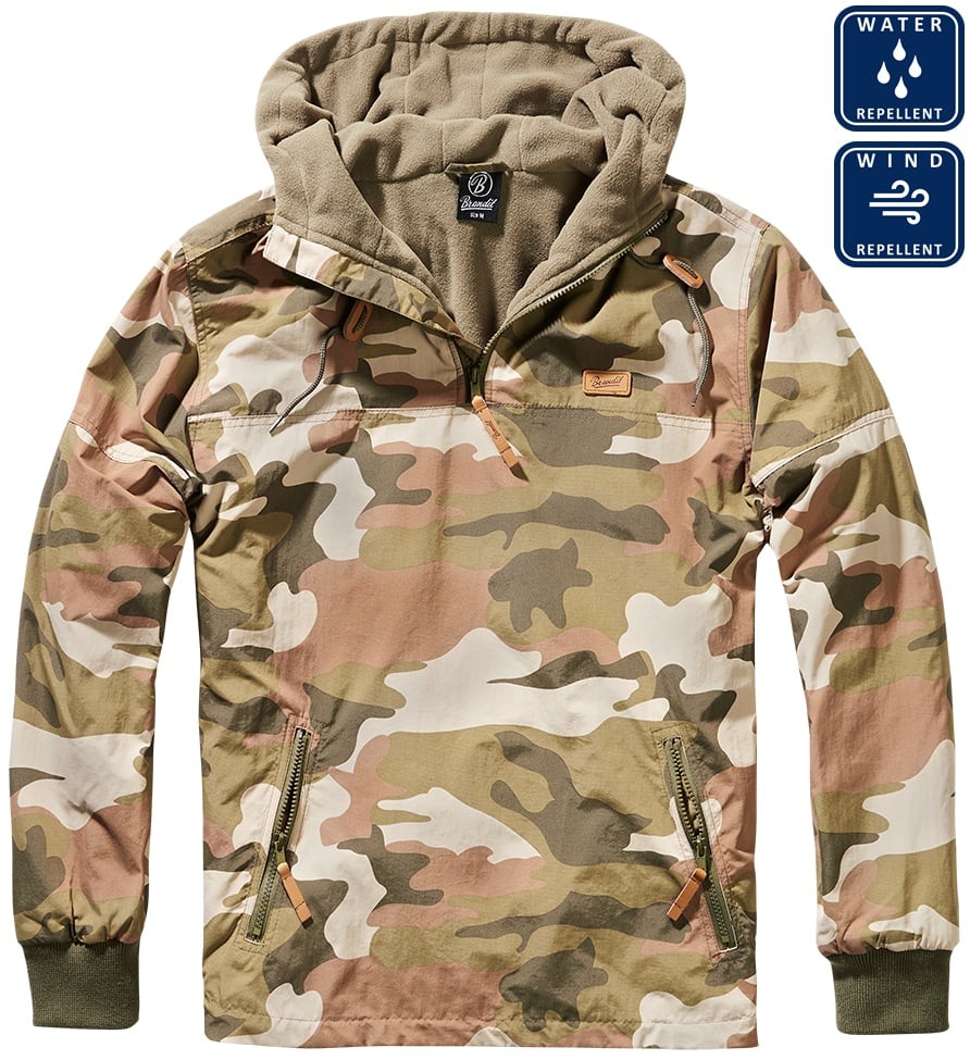 Denna varmt fodrade vindjacka i kamouflagemönster är designad för att stå emot både vind och vatten. Jackan har ett mjukt fleecefoder som ger extra värme under kalla dagar. Detaljer i läder vid dragkedjor och dragsko ger jackan en stilfull touch.