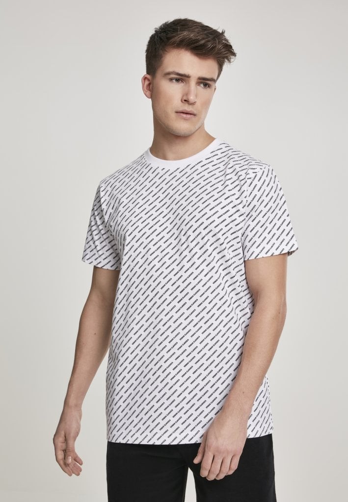 En vit T-shirt från Urban Classics med ett tryck av märkets logotyp i ett randigt mönster över hela tröjan. T-shirten är tillverkad i 100% bomull och har en klassisk passform.