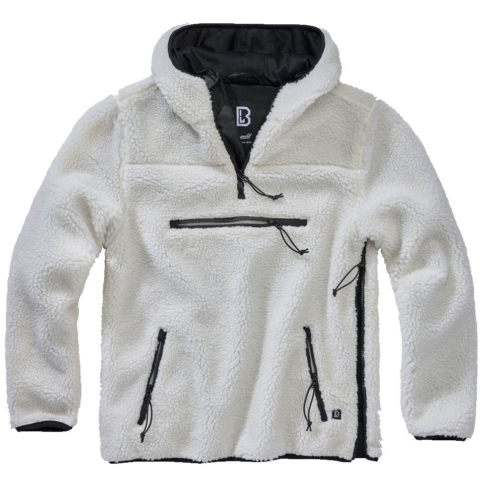 En vit teddyfleece worker pullover som är både varm och bekväm. Jackan har flera praktiska fickor, inklusive en rymlig bröstficka och sidofickor. Den är fodrad med ett meshtyg för god andningsförmåga och har elastiska muddar för en bra passform.