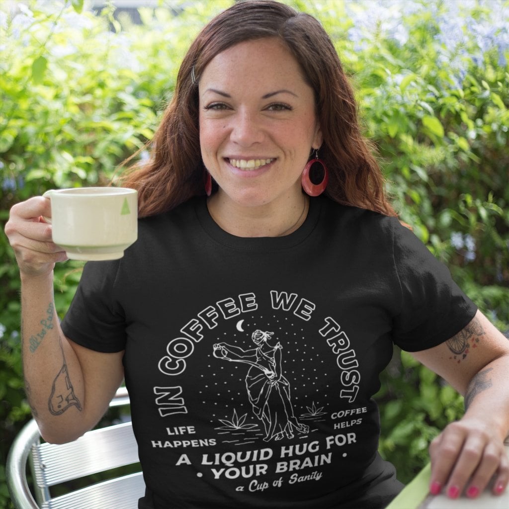 En svart T-shirt med texten 'In coffee we trust' och en rolig beskrivning om kaffe som en 'flytande kram för hjärnan'. T-shirten är tillverkad i bomull och finns i flera storlekar för både dam och herr.