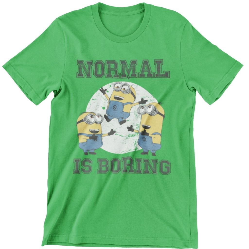 En grön barn-t-shirt med trycket 'Normal Life Is Boring' och motiv från filmen Minions. T-shirten är tillverkad i 100% bomull och är bekväm för barn att bära.