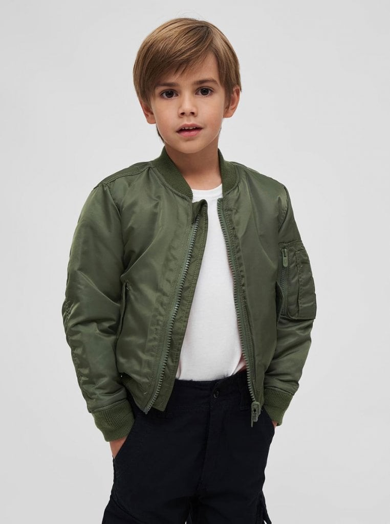 En klassisk olivgrön bomberjacka för barn, inspirerad av den ikoniska MA1-modellen. Jackan har ett slitstarkt nylontyg och ett orange foder, precis som originalet. Med sin rejäla stoppning håller den barnet varmt och bekvämt.