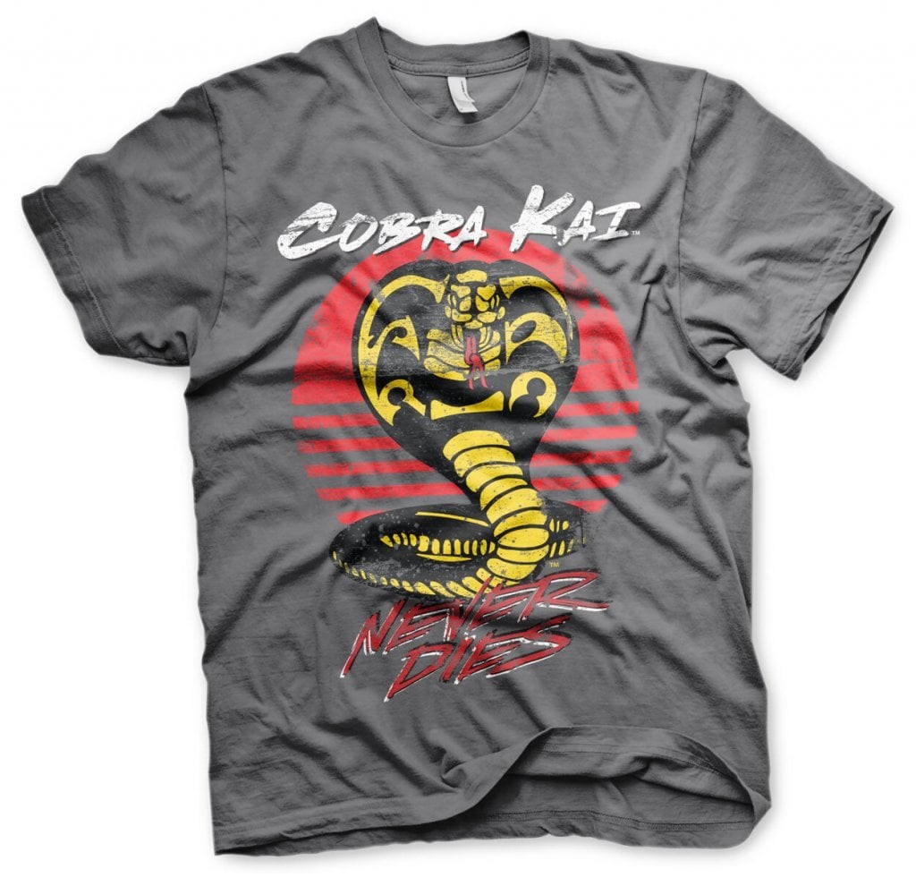 Visa din kärlek för Cobra Kai med denna mörkgrå T-shirt. Den har ett tryck med texten 'Cobra Kai Never Dies' och är gjord i 100% bomull. Perfekt för fans av serien som vill visa sin lojalitet.