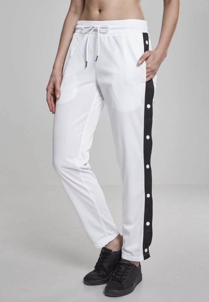 Dessa byxor för damer har en färgstark rand längs sidorna, prydd med dekorativa tryckknappar som kan öppnas. Byxorna har en rak passform, praktiska sidfickor och en bekväm resår i midjan.
