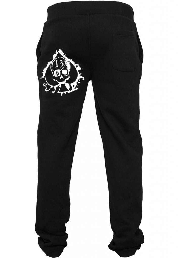 Dessa svarta joggingbyxor har en avslappnad passform med bred mudd i midjan och bensluten. Designen inkluderar en spader-kontur med en skalle och siffran 13 på vänster baksida, vilket ger en edgy touch. Tillverkade i en blandning av bomull och polyester för komfort och hållbarhet.