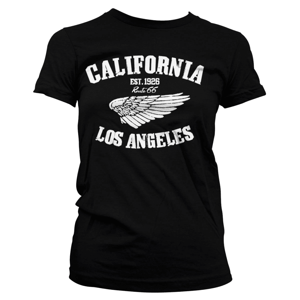 En svart t-shirt för damer med en stor Route 66-logotyp. Logotypens bakgrund är mönstrad med den amerikanska flaggan. T-shirten är tillverkad i 100% bomull och finns i storlekarna S till XXL.