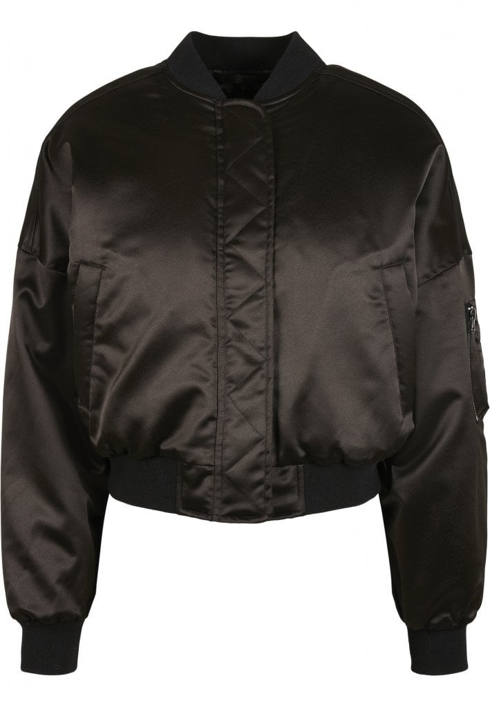 Denna svarta bomberjacka i satin är ett stilfullt val för damer, perfekt för vårens och sommarens kyligare kvällar. Jackan har en dragkedja framtill och ribbade muddar för en modern look.