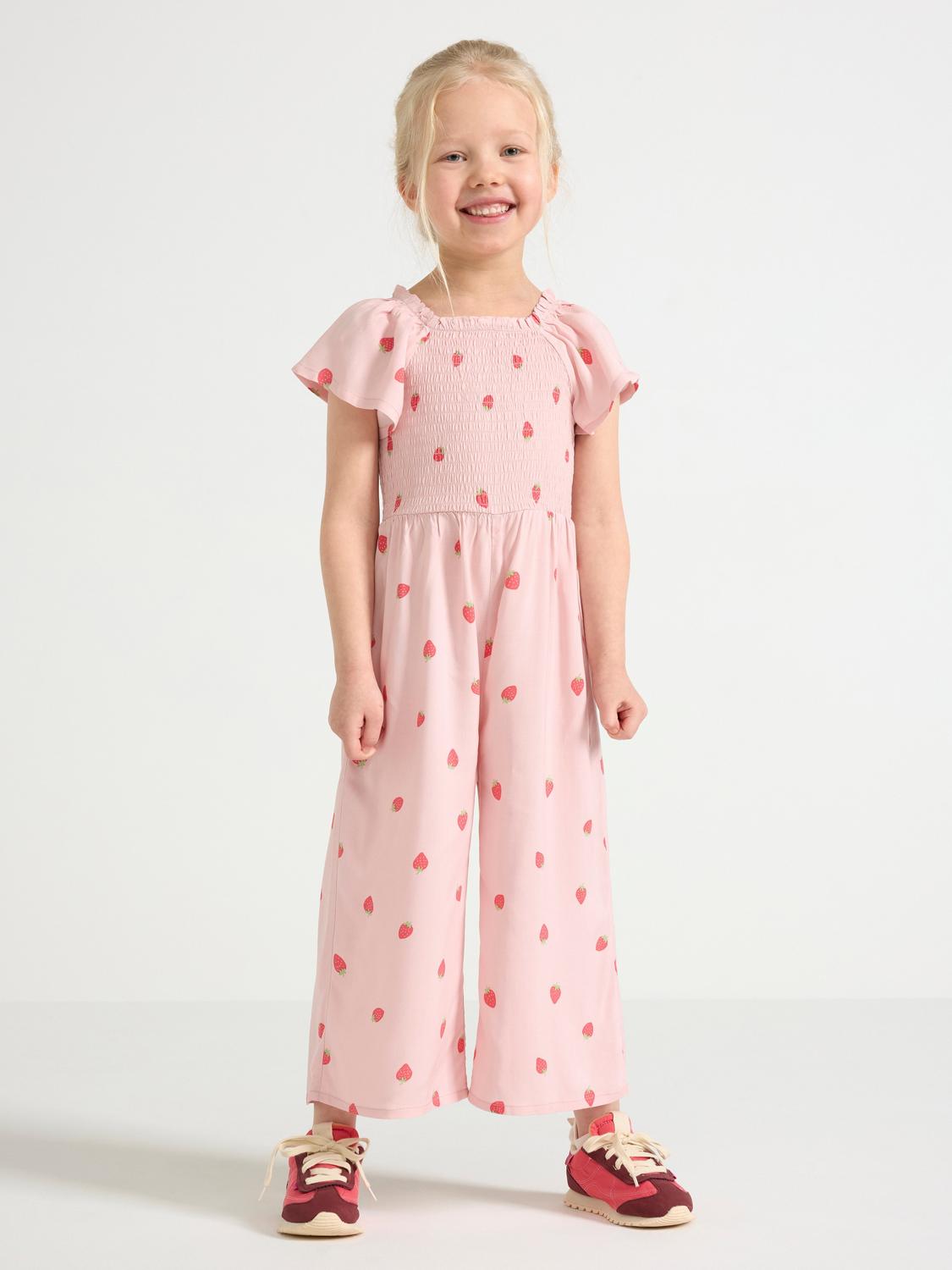 Denna jumpsuit för dam är perfekt för sommaren. Den har en V-ringning, justerbara spaghettiband och en lös passform. Jumpsuiten är tillverkad av modal och polyester och har vida, ¾-långa ben.