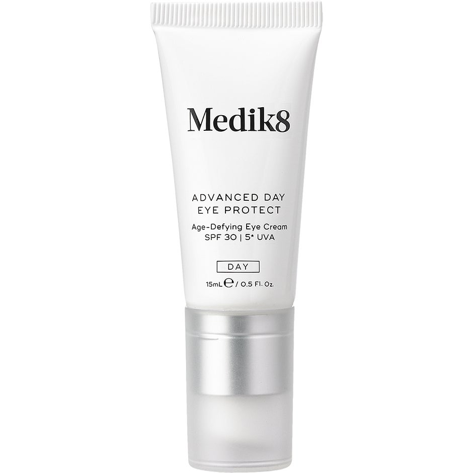 Medik8 Advanced Day Eye Protect SPF 30 är en återfuktande ögonkräm som motverkar svullnad och påsar under ögonen samt minimerar linjer. Den har SPF 30, 5*UVA-skydd, skyddar mot luftföroreningar samt anti-infrarött och -blått ljus. Den innehåller extrakt från moringa, moringa används ofta som naturlig rengöring. Det drar till sig smuts och orenheter så att de lätt kan sköljas av. Moringa bildar en film över huden och fungerar som en ”sköld mot stadsmiljön” som stöter bort föroreningar innan de kan bilda fria radikaler som kan orsaka förtida åldrande. Den innehåller även L-Karnosin, ett aktivt ämne som motverkar glykosylering, hjälper till att stimulera kollagensyntesen och skyddar mot skador från infraröd strålning. Den innehåller även extrakt från kakaoböna, detta kraftfulla extrakt skyddar huden från skadligt blått ljus, samtidigt som det motverkar skadliga fria radikaler och boostar kollagenproduktionen. Passar alla hudtyper. Efter rengöring på morgonen: applicera en liten mängd Advanced Day Eye Protect under och runt ögonen – undvik ögonlocken.