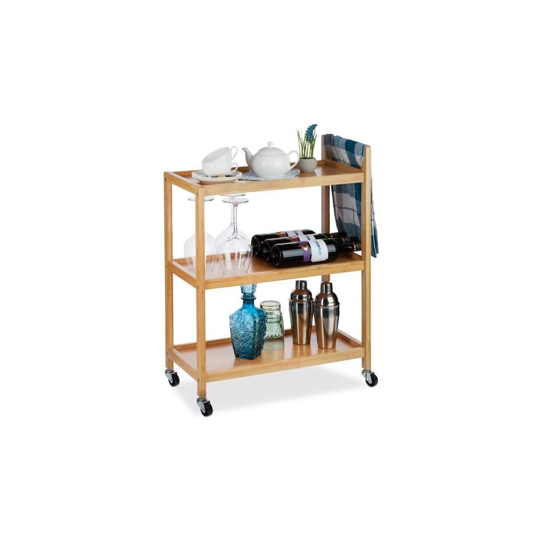 Denna lilla bambuvagn är en praktisk lösning för att organisera ditt hem. Med tre hyllor och hjul är den lätt att flytta runt och passar perfekt för förvaring av diverse föremål i badrum, kök eller pysselrum.
