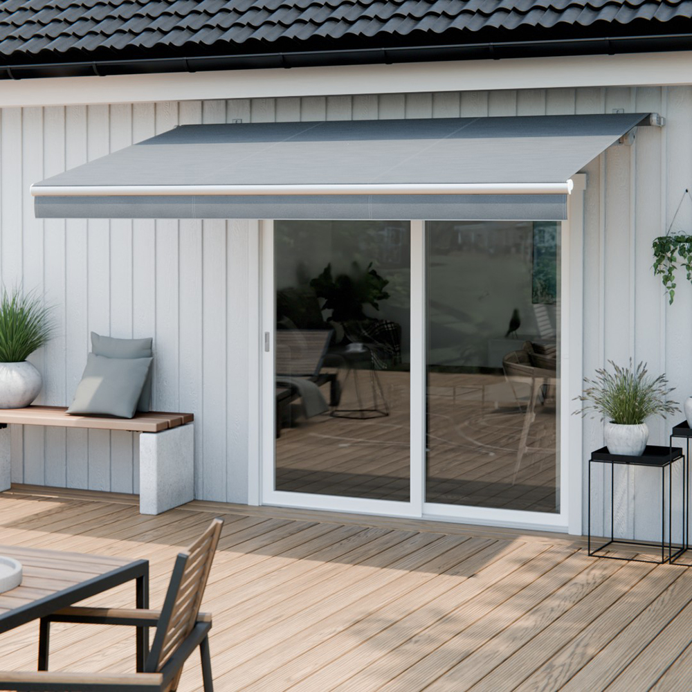 Njut av skön skugga under soliga dagar Koppla av på din uteplats med skydd mot både sol och insyn. Njut av svalkande skugga på din uteplats med våra terrassmarkiser. Miljöbilderna visar en terrassmarkis med tyget Granat 201. UV-skydd och färgbeständighet Markisväven garanterar dig ett mycket gott skydd mot UV-strålning, värme och bländning. Markisväven är producerad i 100 % spinnfärgad akryl vilket ger den en utmärkt färgbeständighet över tid samt god tålighet mot UV strålar. Vatten- och smutsavvisande Behandlingen av väven ger en vattenavvisande yta vilket innebär att vattnet inte tränger in i tyget. Väven skyddar dig mot lättare regn. Behandlingen gör även väven smutsavvisande vilket medför att påväxt som mögel undviks. För att bevara väven fräsch över tid skölj bort damm, pollen och annat skräp på väven regelbundet. Väven i sig möglar inte men det kan bildas påväxt i material som fastnat ovanpå väven. Hållbarhet Högeffektiva fibrer, behandlingar och vävmetoder gör det möjligt att