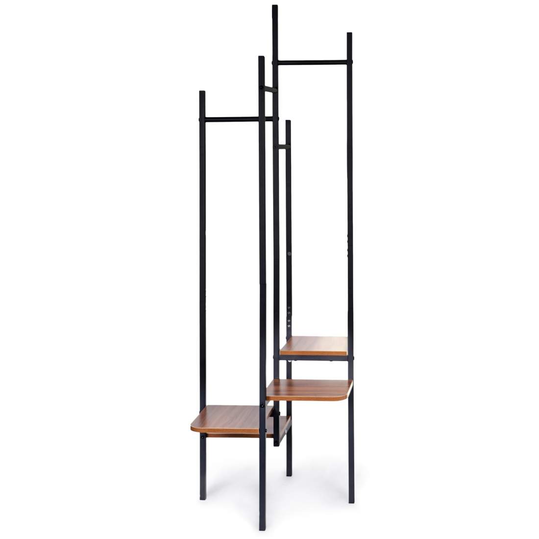 Denna stående klädhängare kombinerar stil och funktion med sin moderna design och praktiska hyllor. Tillverkad av pulverlackerat stål, erbjuder den en stabil och hållbar lösning för att organisera kläder och tillbehör. Med plats för både hängande kläder och förvaring på hyllor, passar den perfekt i alla typer av hem eller kontor.