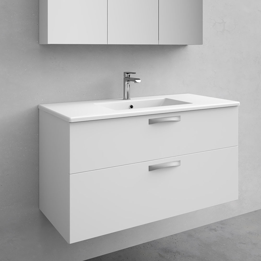 Kommod med tvättställ Noro City En badrumsmöbel som håller en enhetlig och funktionell design rakt genom. City har ett stort urval av bredder, färger och detaljer som enkelt kan anpassas för just ditt badrum. Du väljer mellan fem bredder, från 600 till 1200 mm, för stora till små badrum. City tvättställsskåp har mjukstängande lådor med fullutdrag. Justerbara upphängningsbeslag för enkel installation och justering. Lådinredning och uttagbar lådmatta ingår. OBS! Vattenlås, handtag och blandare medföljer ej. Rengöring Rengör med fuktad trasa, använd milda rengöringsmedel vid behov. Undvik medel med slipande effekt, syror och ammoniak. Våra möbler är utrustade med vattenavstötande material, dock tål de inte direkt vattenkontakt under en längre tid. Vid montering nära badkar eller dusch bör badkarsvägg, duschvägg eller annan avskärmning användas. Handfat i porslin Porslin är ett vackert lergods med hård glaserad yta. Använd mjuk trasa och rengöringsmedel med PH värde under 8. Vid generella